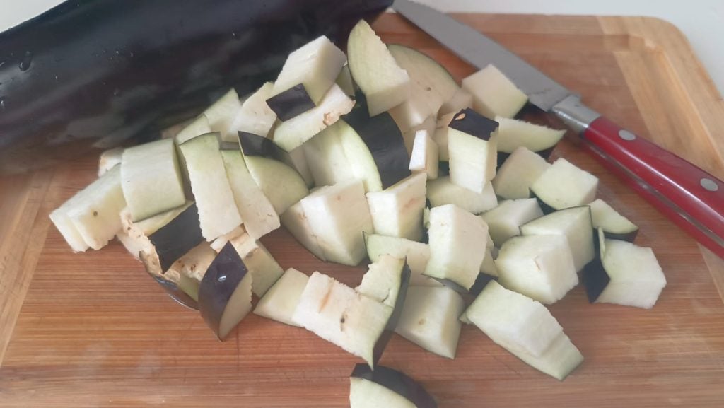 • Mientras los tomatitos se cocinan, cortar las berenjenas en cubos