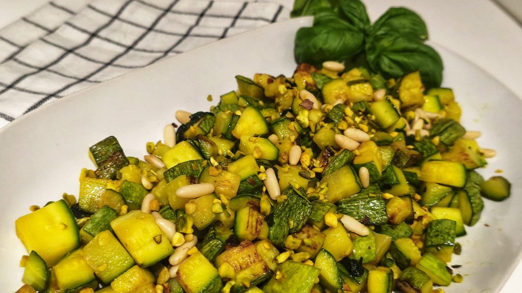Los calabacines, ricos en fibras y vitaminas, se cocinan rápidamente en la sartén, manteniendo su consistencia suave pero no deshecha. Los piñones tostados liberan un aroma delicioso, mientras que el pistacho triturado confiere un toque gourmet y un sabor delicadamente mantecoso.