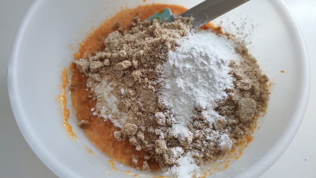 • Incorpora la harina de arroz, la harina de almendra, la levadura, la ralladura de naranja y mezcla con suavidad con una espátula.