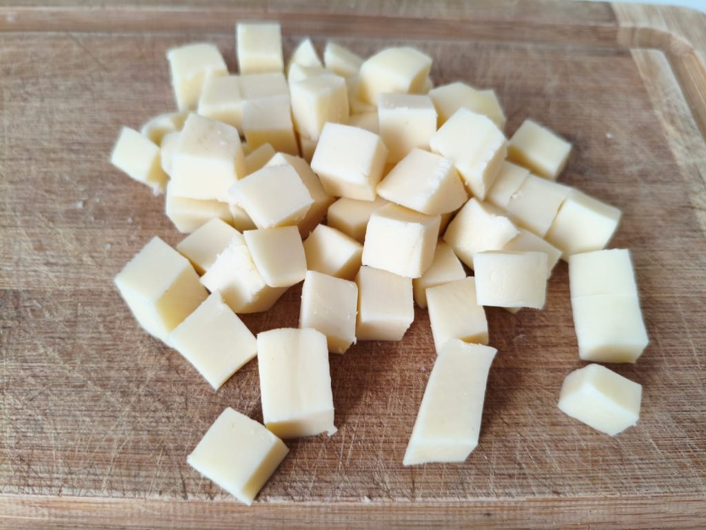 Cortar el galbanino en cubos. Tomar una fuente para hornear, verter unas cucharadas de bechamel en el fondo y añadir los ramilletes de coliflor, los cubitos de galbanino y la bechamel.