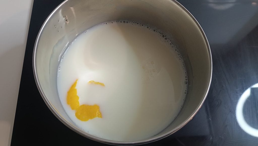 En un cazo, calentar la leche con la cáscara. Una vez caliente, verter la mezcla de huevos y seguir mezclando.