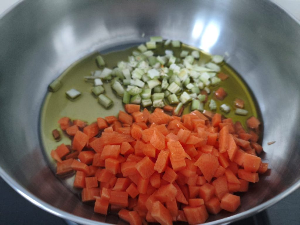 Pica finamente el apio, la zanahoria y la cebolla. Sofríelos en aceite. Añade la carne picada y dórala bien.