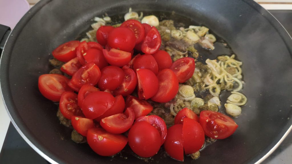 Agregar los tomatitos cortados a la mitad, cocinar y ajustar de sal. Mientras tanto, preparar los ñoquis triturando los frijoles.