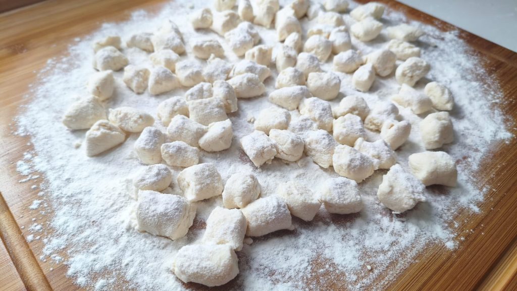 Divide la masa en cilindros y corta los ñoquis. Puedes dejarlos lisos o marcarlos con un tenedor.