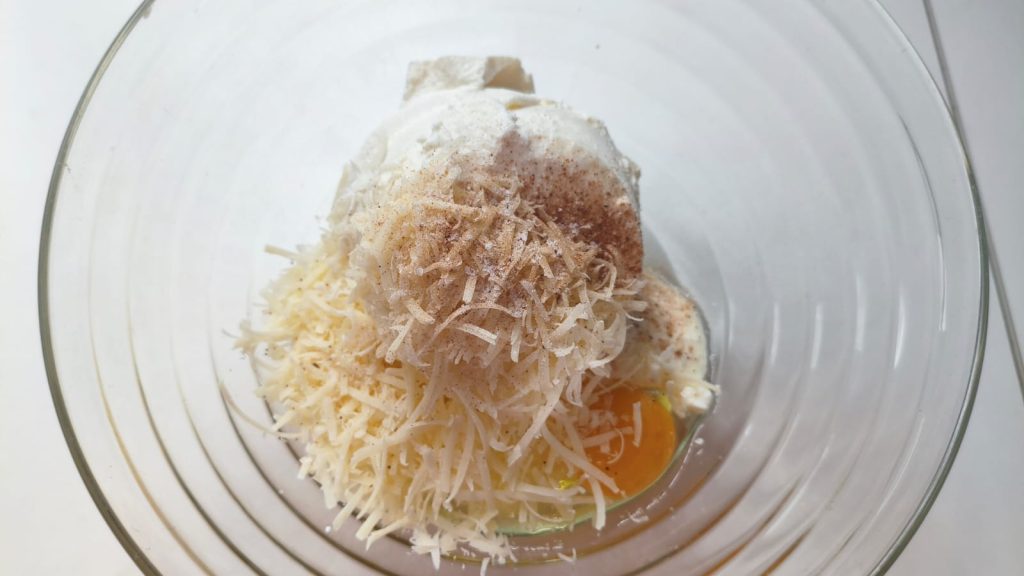 Pon la ricotta en un bol y trabájala con un tenedor. Añade el huevo, una pizca de sal y el parmesano y una pizca de nuez moscada.