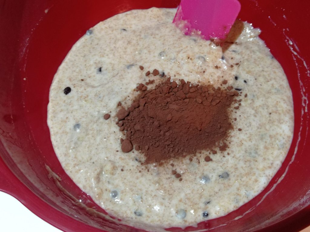• A la mezcla añadir la harina (yo usé integral pero también sirve la 0 o 00) mezclar con una espátula, agregar la levadura y las gotas de chocolate dejando algunas para decorar. Incorporar también el cacao.