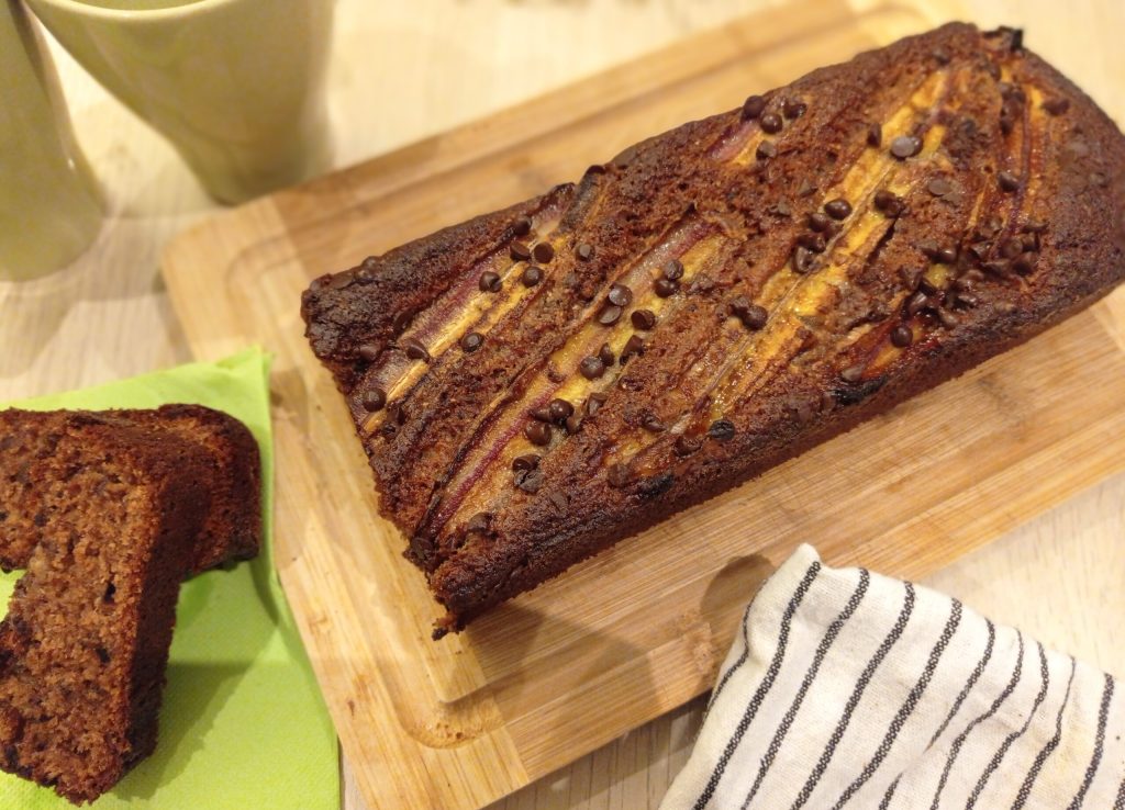• Engrasar y enharinar un molde, verter la mezcla y colocar encima el plátano restante con las gotas de chocolate. Hornear a 180° durante 50 minutos.