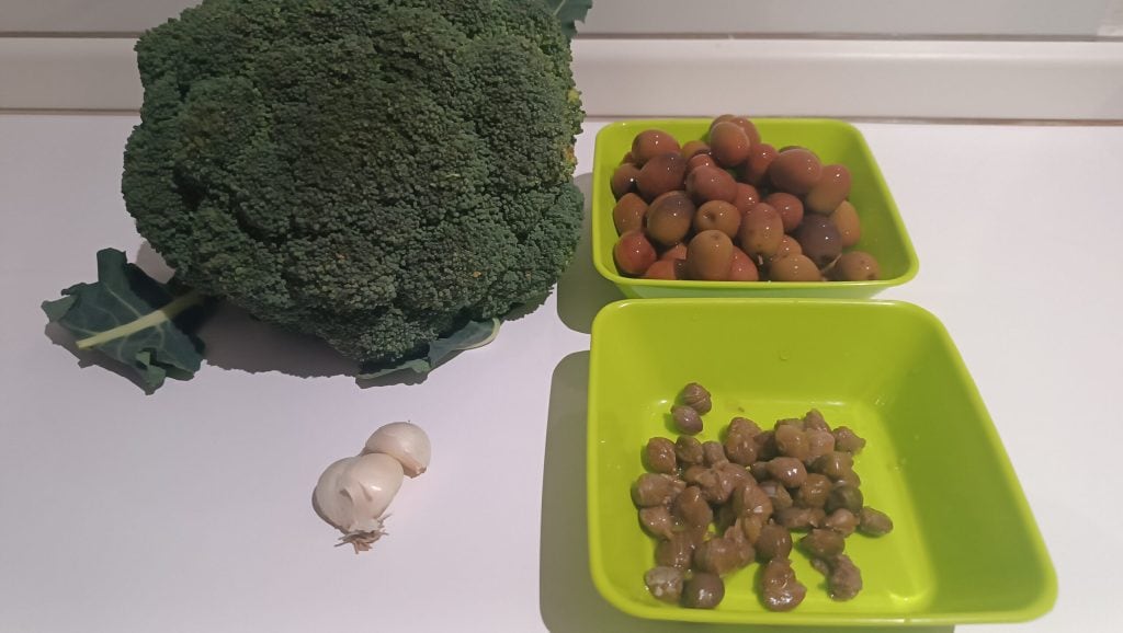 Pasta con brócoli, aceitunas y alcaparras