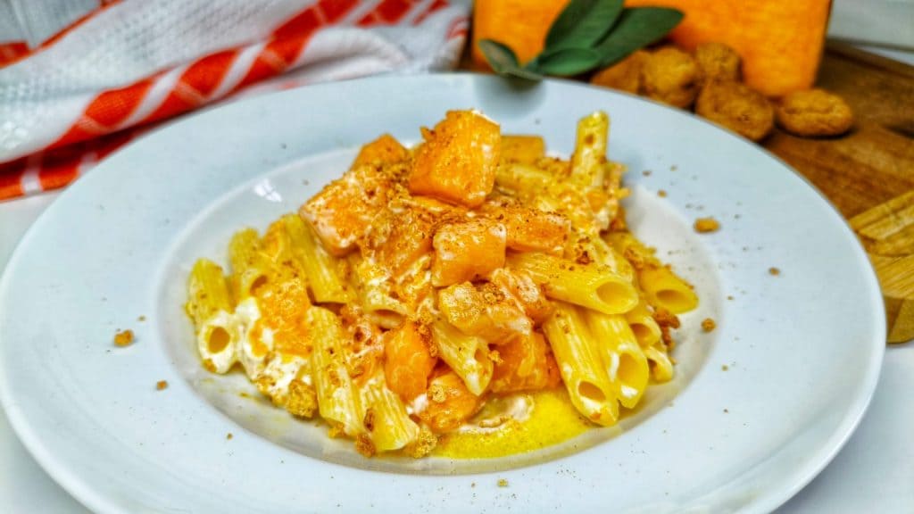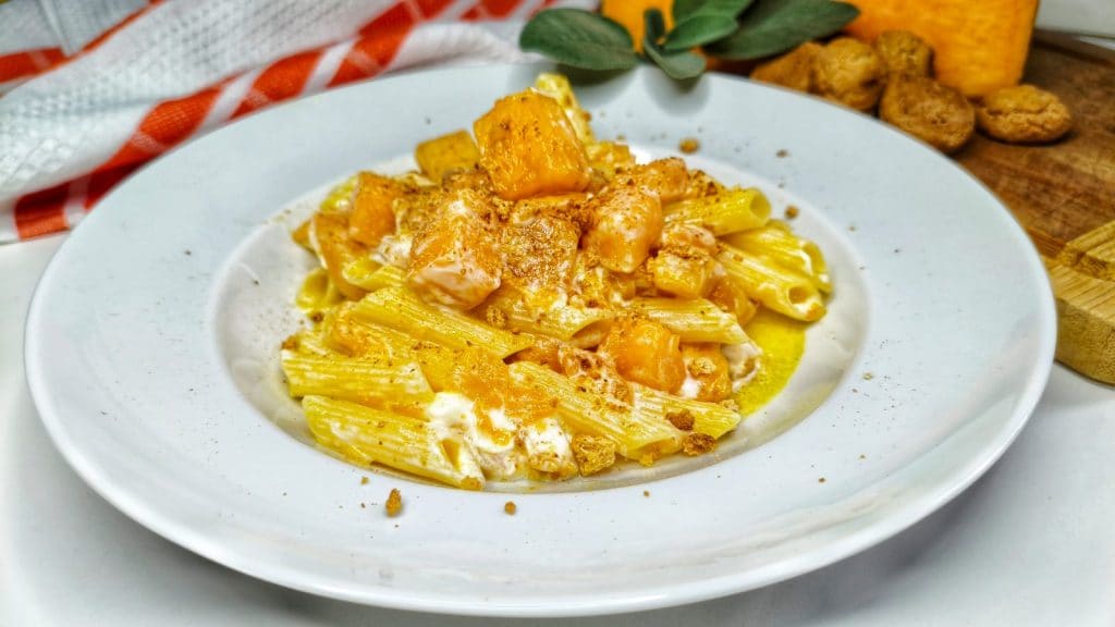 Preparar la pasta con calabaza cremosa, perfumada e irresistible requiere pocos ingredientes: calabaza fresca, cebolla o chalota, aceite de oliva virgen extra, una pizca de sal y pimienta… y quizás un toque de salvia o romero para realzar el aroma del otoño. Si queréis hacerla más rica, podéis añadir panceta crujiente, queso rallado o una pizca de nuez moscada. Yo he añadido unos amaretti triturados y una cucharada de queso untable.