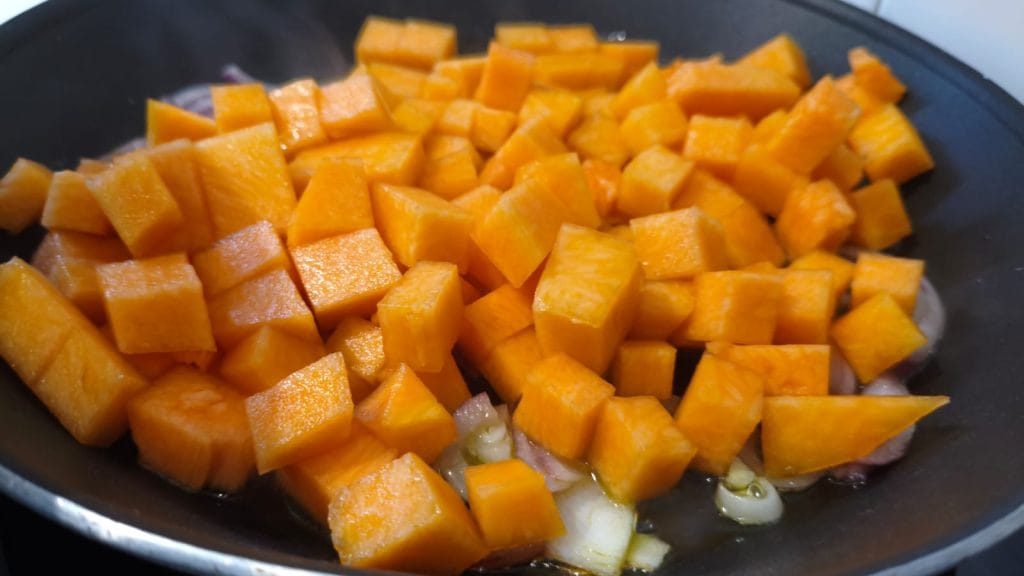 Una vez cocida la cebolla, añade los cubos de calabaza y las hojas de salvia, déjalos saltear unos minutos.