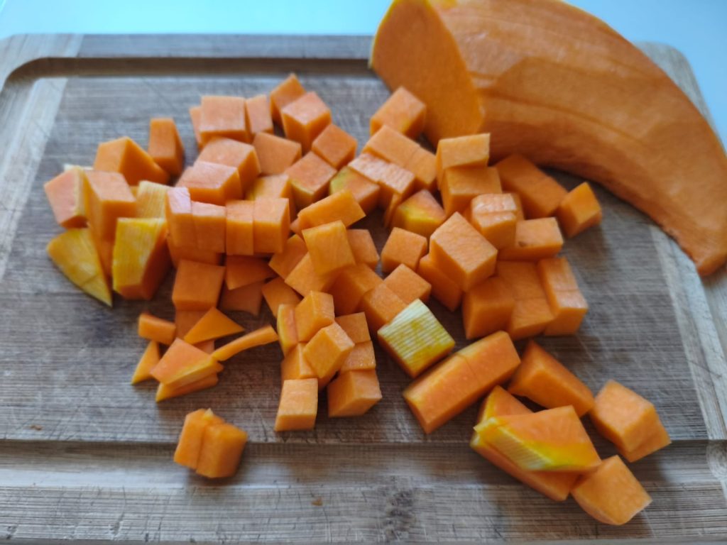 Limpia la calabaza, quita la piel y córtala en cubitos pequeños.