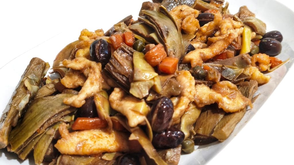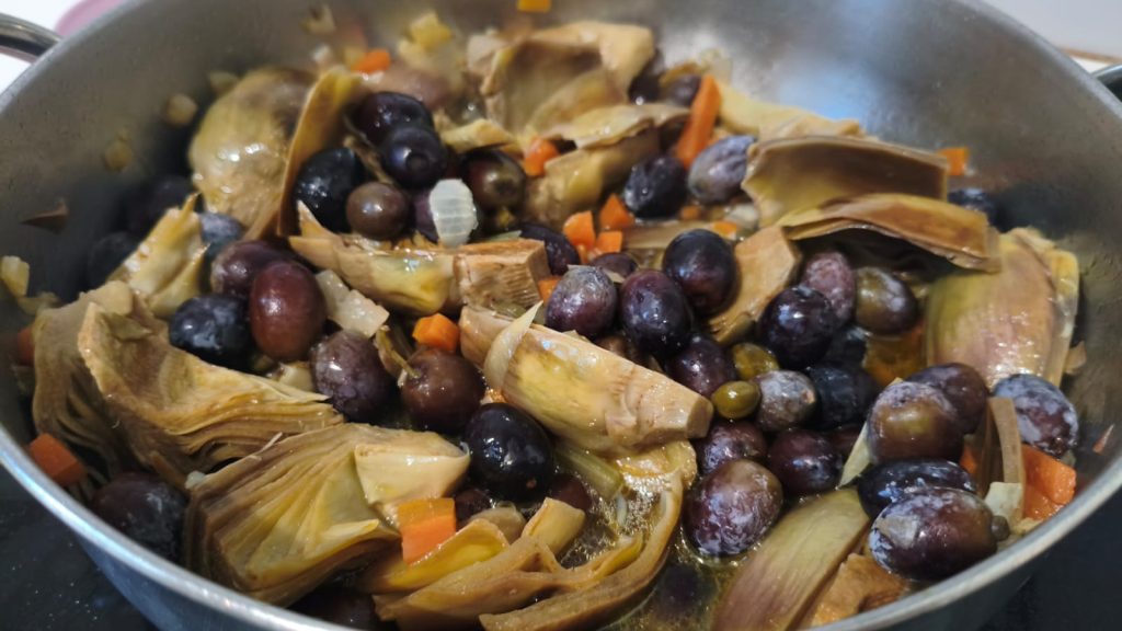 La preparación de este plato es sencilla y rápida. Después de limpiar y cortar las alcachofas frescas, se doran en una sartén con un poco de aceite de oliva virgen extra y un diente de ajo. La pechuga de pollo se dora aparte, luego se une con las alcachofas y las aceitunas negras o verdes, rociando con un poco de vino blanco para realzar los sabores. Todo se deja cocinar hasta obtener una consistencia suave y jugosa.
