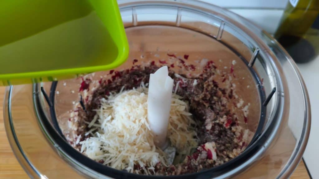 Agregar el parmesano y el aceite de oliva virgen extra y mezclar nuevamente hasta obtener un pesto denso y cremoso.