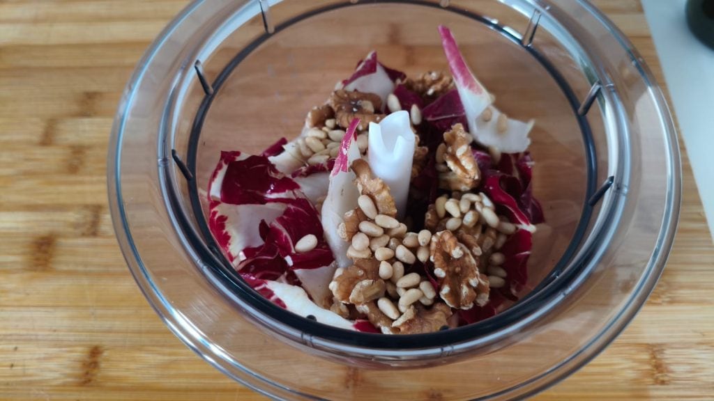 Preparar este pesto de achicoria rápido es realmente sencillo: se lava la achicoria, se seca bien y se corta en trozos grandes. Luego se pone todo en la batidora con ajo, nueces, piñones, queso rallado, una pizca de sal y aceite de oliva virgen extra. En pocos minutos tienes listo un condimento cremoso, perfumado y súper versátil.