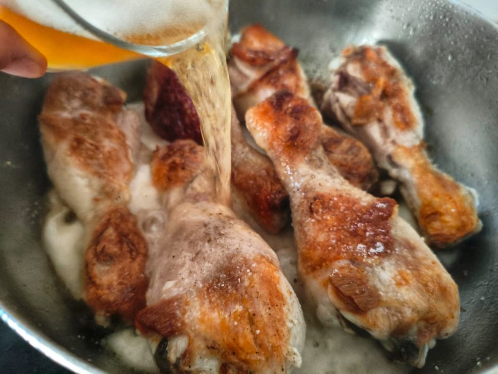 Después de haber evaporado el vinagre, girar los muslos de pollo, sazonar con sal y pimienta y verter la cerveza. Cocinar la carne durante unos veinte minutos hasta que la salsa se reduzca.