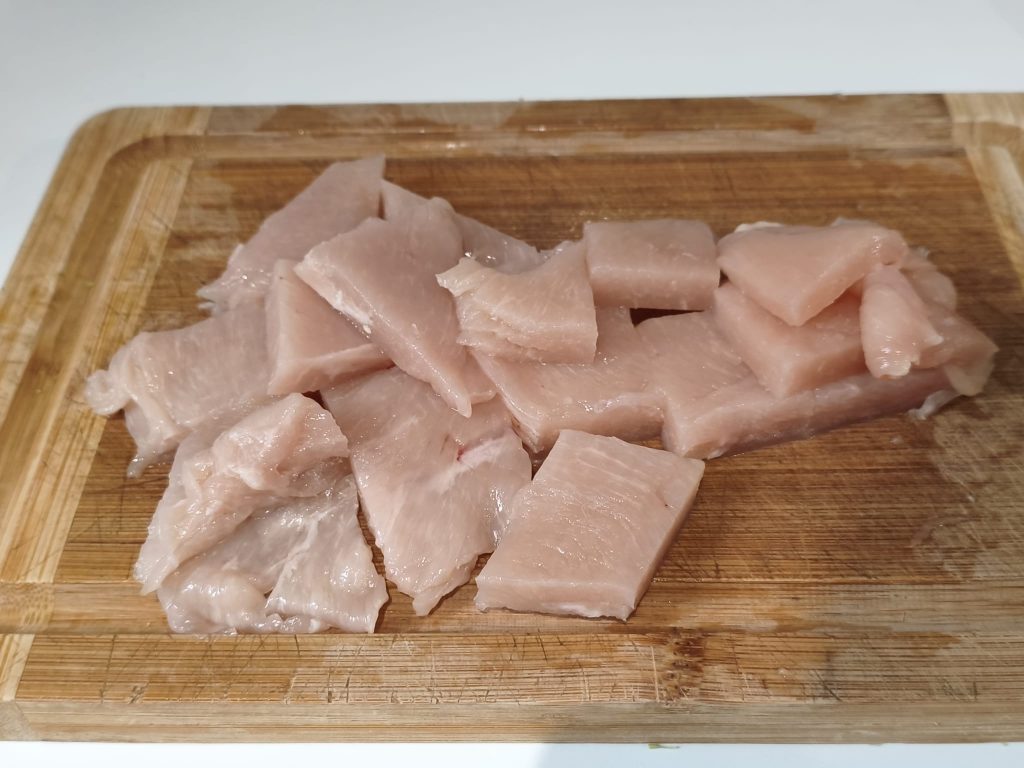 Prepara el pollo: corta la pechuga de pollo en rodajas o trozos, enharínalos ligeramente y resérvalos.