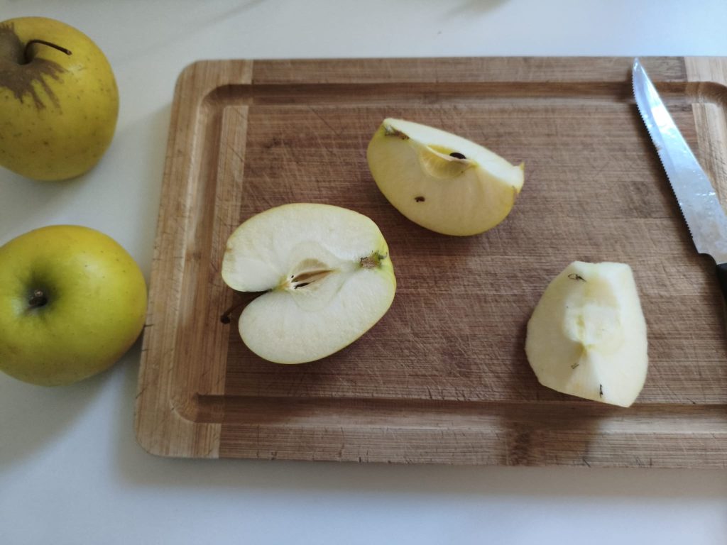 Preparar las manzanas: pélalas, córtalas en trozos y ponlas en una sartén con un poco de agua. Déjalas cocinar a fuego medio hasta que estén suaves y cremosas.