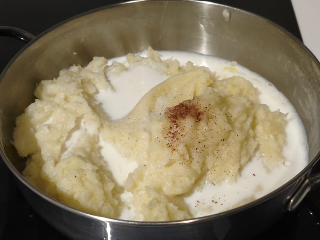 Pasa el puré a una sartén antiadherente y añade la leche, un chorrito de aceite, sal, pimienta y una generosa ralladura de nuez moscada.