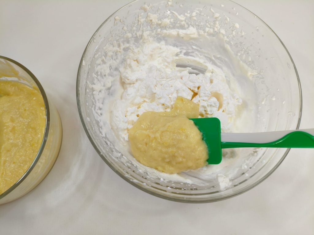 Unir la crema fría a la nata delicadamente mezclando de abajo hacia arriba para no desmontarla.