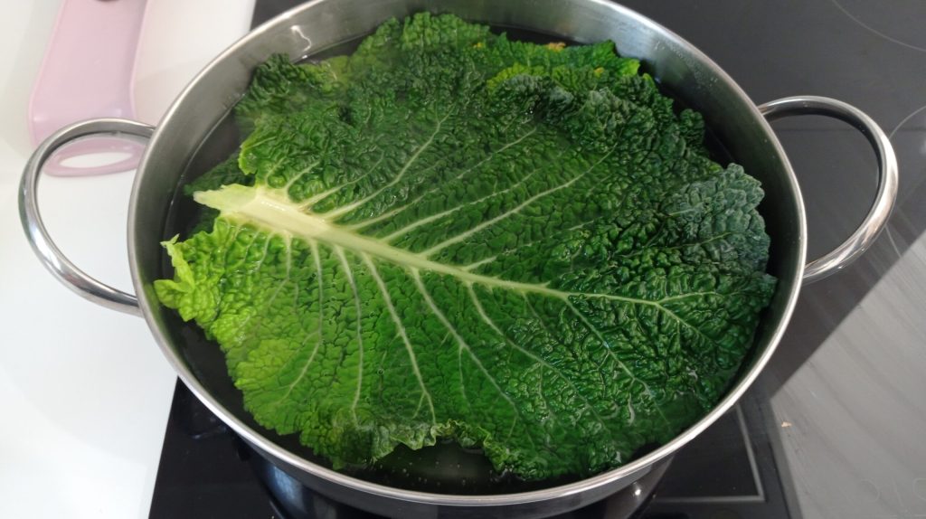 Escalda las hojas de col. Sumérgelas en agua hirviendo con sal durante 2-3 minutos, luego escúrrelas y déjalas enfriar sobre un paño de cocina.