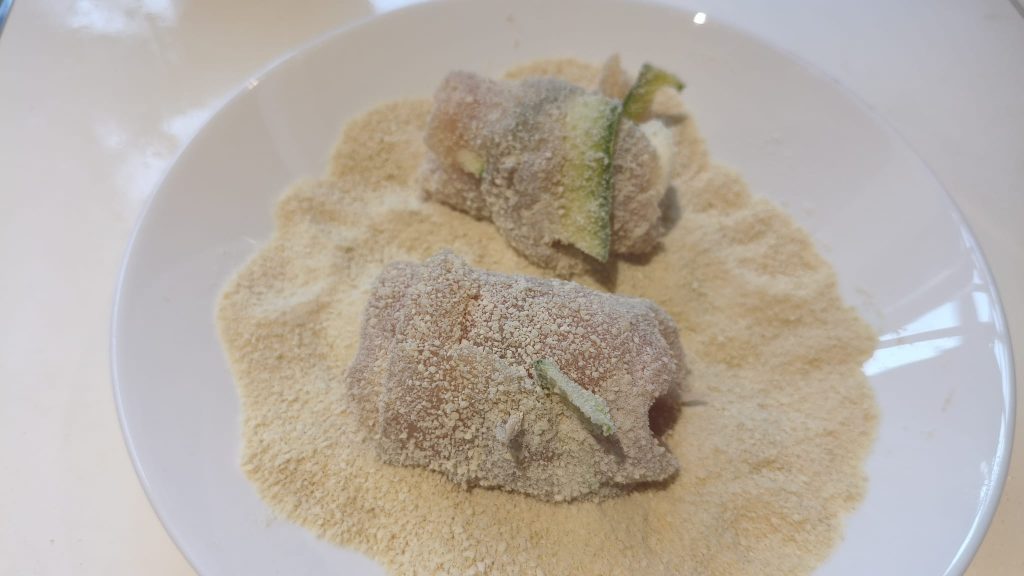 Lo bonito es que esta receta fácil con pechuga de pollo se prepara en muy poco tiempo y con pocos ingredientes. Yo he usado la mandolina para cortar finamente los calabacines — así quedan delgados y se cocinan en un momento. Luego he hecho capas muy simples: una loncha de pechuga de pollo, una de calabacín, una de jamón cocido y un trocito de queso galbanino. Se enrolla todo con delicadeza, se asegura con un palillo, los he pasado rápidamente por pan rallado y a la sartén con un chorrito de aceite. Bastan pocos minutos de cocción y el resultado es para chuparse los dedos.