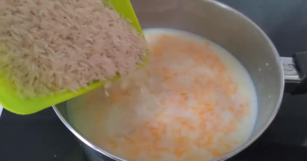 Cuando la leche esté caliente, añadir el arroz y una pizca de sal.