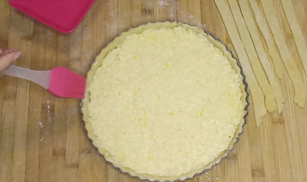 Extender la masa quebrada sobrante y cortar tiras lo suficientemente largas como para cubrir la tarta.