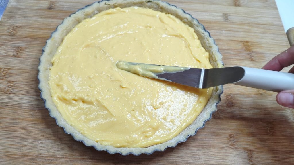 Pincha el fondo con las púas de un tenedor y vierte una parte de la crema pastelera.