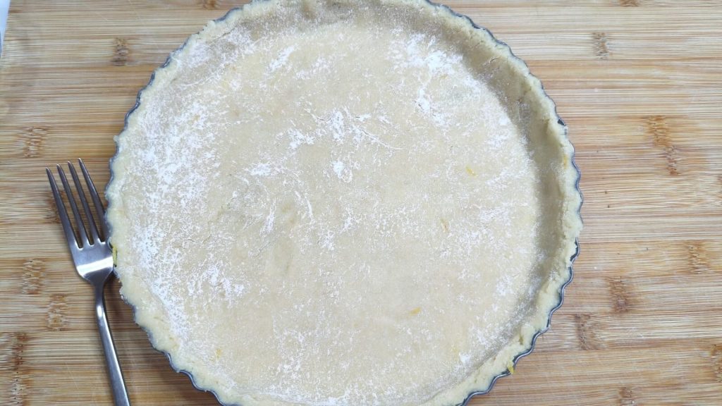 Cuando la masa quebrada ha reposado en el frigorífico, toma un poco más de la mitad, estírala con el rodillo y colócala en un molde para tarta ya enmantecado y enharinado.