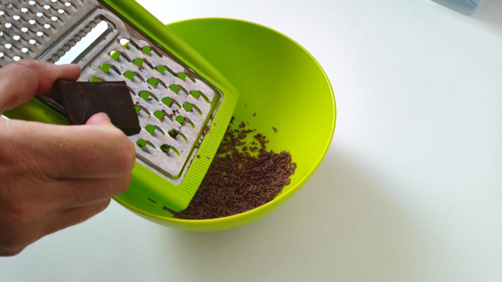 Ralla el chocolate y colócalo en la superficie. Toma la crema reservada y colócala en una manga pastelera para hacer pequeños adornos a gusto.