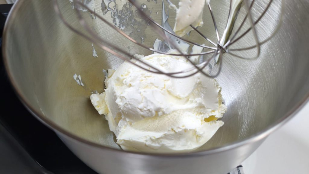 Mientras tanto, prepara la crema: en el robot de cocina o en un bol, coloca el mascarpone, el queso crema y el azúcar glas. Mezcla con las varillas eléctricas.