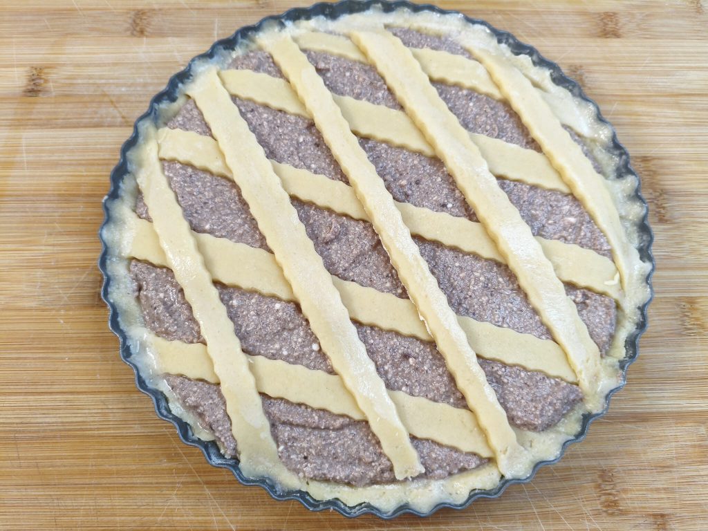 Extiende el resto de la masa quebrada sobrante, corta tiras y colócalas sobre la tarta.