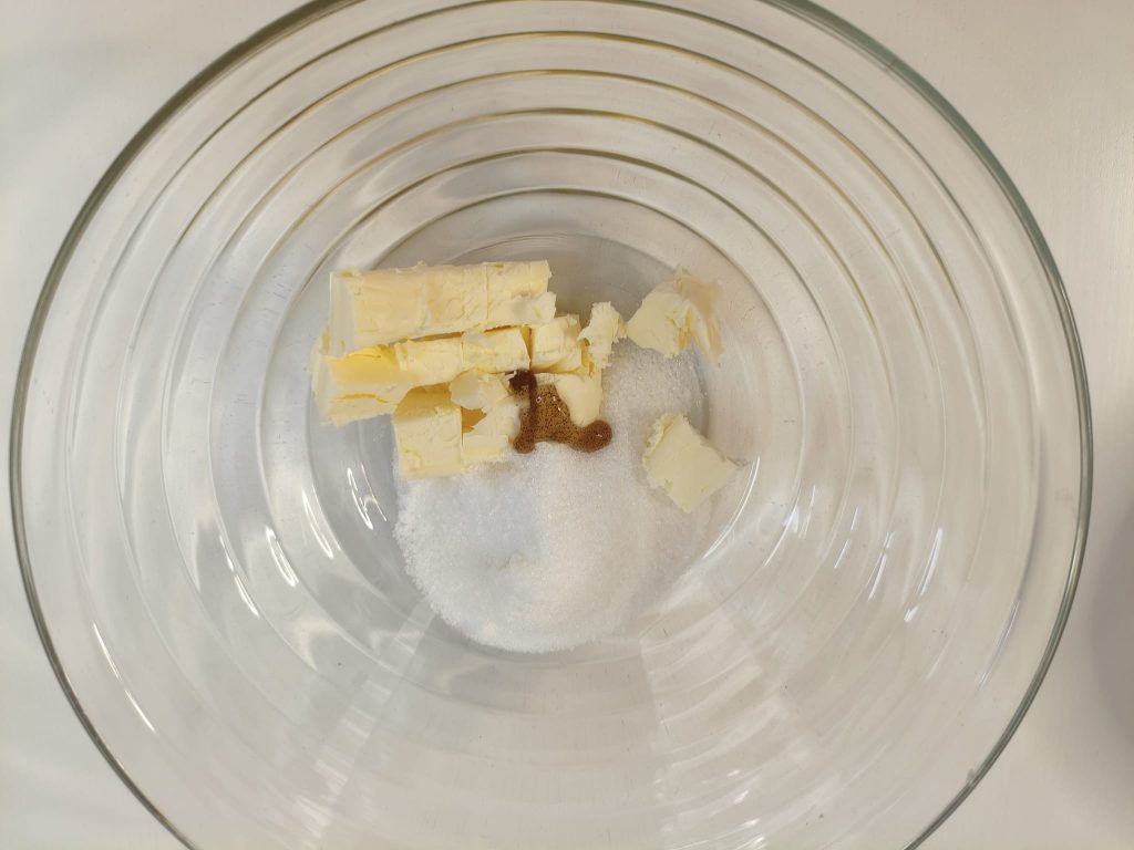 Prepara la masa quebrada colocando en un bol la mantequilla con el azúcar y el extracto de vainilla y trabaja hasta obtener una crema. Añade los huevos y mezcla bien.