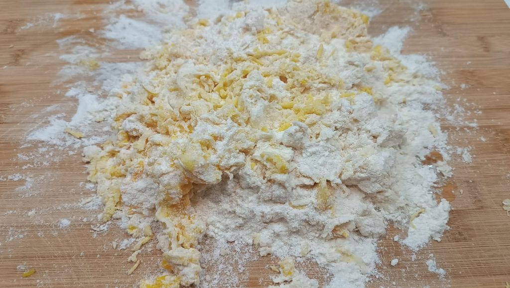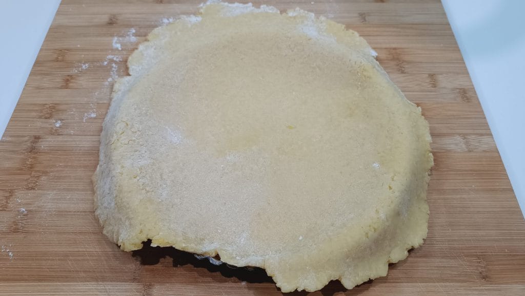 Preparar la masa quebrada disponiendo la harina en forma de volcán: añadir azúcar, huevos, mantequilla y ralladura de limón