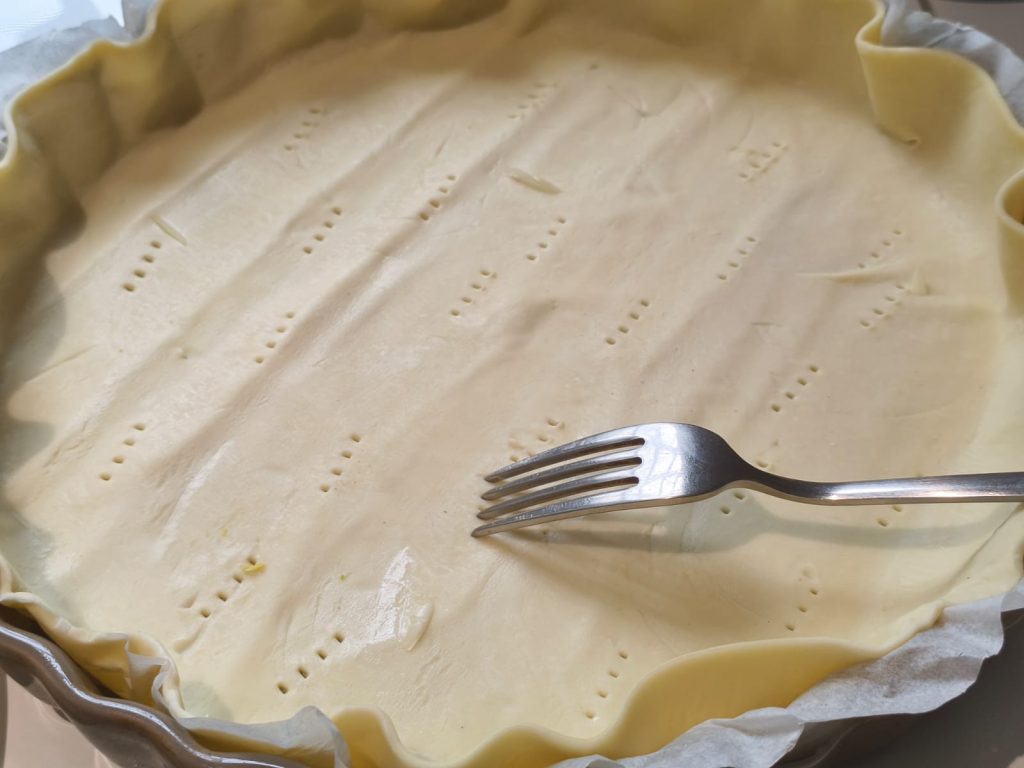 Desenrolla la masa de hojaldre: colócala en una fuente cubierta con papel de horno, dejando los bordes ligeramente altos.