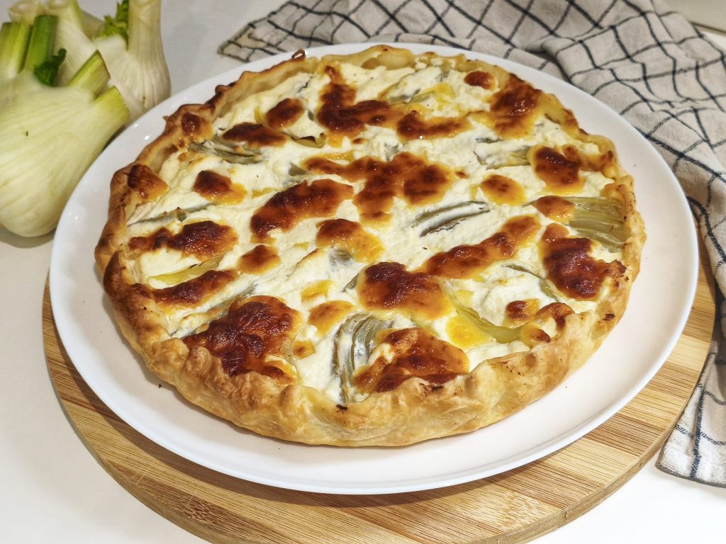 Yo la preparé así: herví los hinojos hasta que se pusieron tiernos, luego desenrollé la masa de hojaldre directamente en el molde. En un bol mezclé ricotta cremosa, nuez moscada, una pizca de sal y galbanino cortado en cubitos. Una crema sencilla pero sabrosa, perfecta para acompañar los hinojos. Llené la base de hojaldre con los hinojos y la crema de ricotta, nivelé bien y ¡al horno!