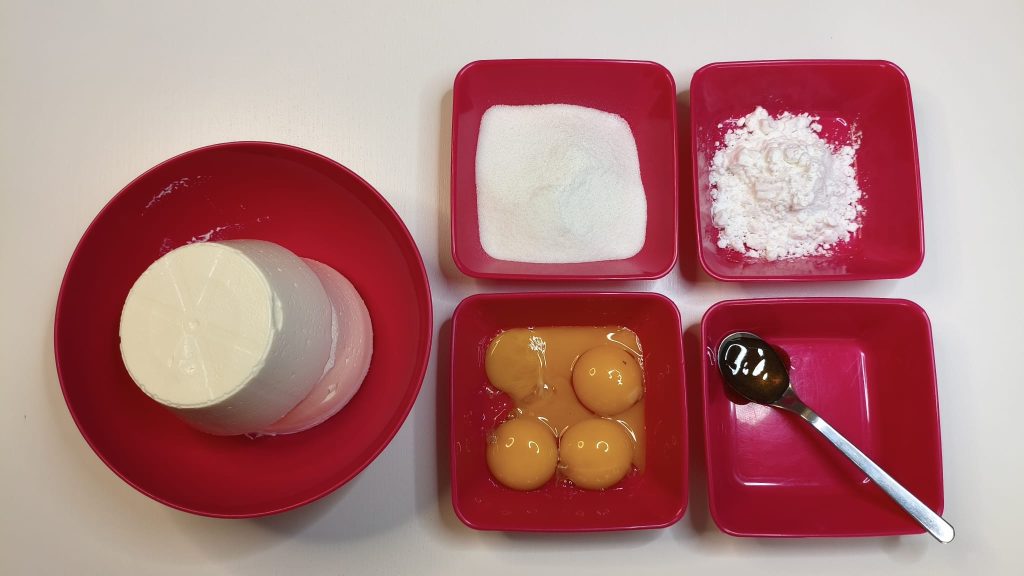Mientras tanto preparar la crema de ricotta. Mezclar en un bol la ricotta con el azúcar y las yemas y remover bien. Añadir la fécula y la vainilla.