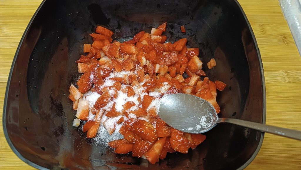 Cortar las fresas y ponerlas en un cuenco con la última cucharada de azúcar, mezclar.