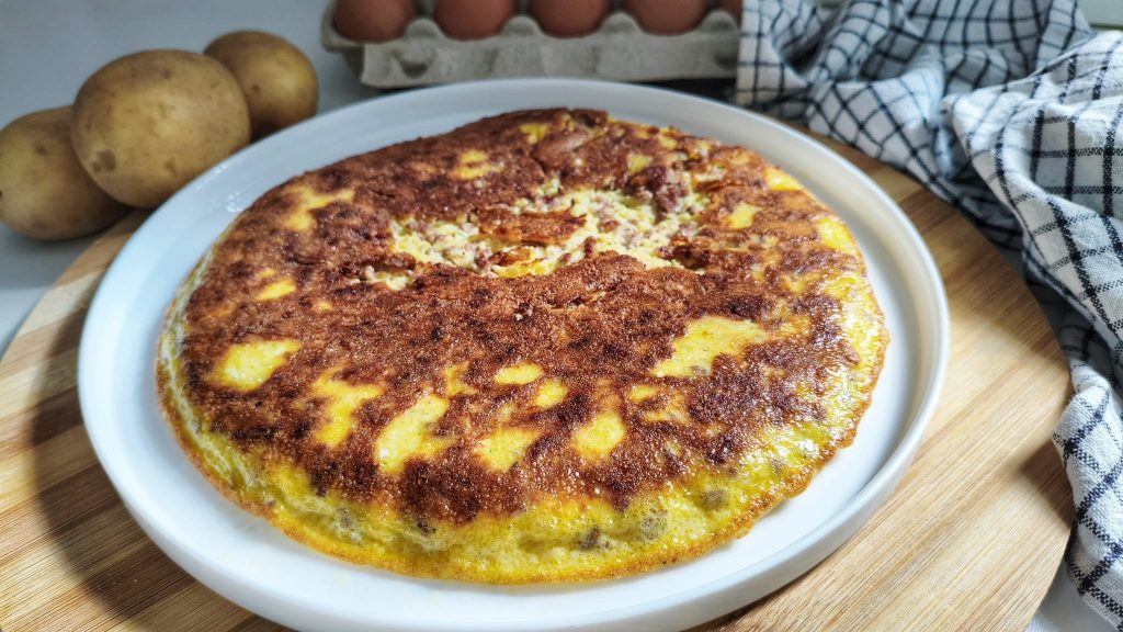 ¡La tortilla con carne y patatas está lista!