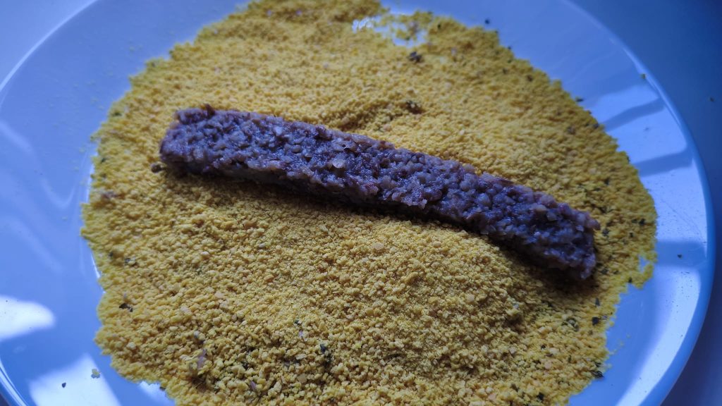 Pasa cada tira por el pan rallado y el orégano, presionando bien para que se adhiera el rebozado.