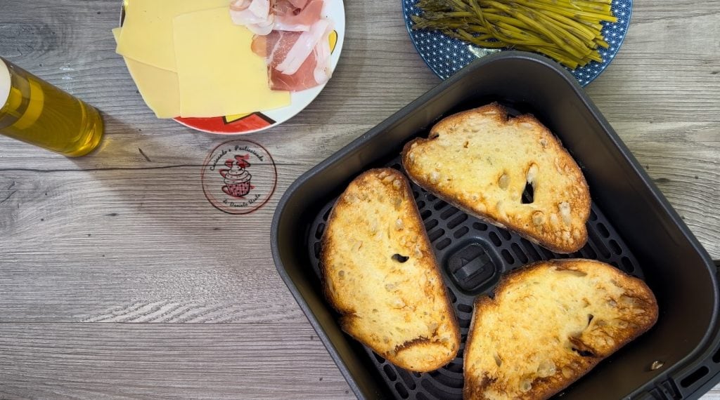 Colocar las rebanadas en la cesta de la freidora de aire, rociarlas con un poco de aceite y asarlas a la parrilla durante 5 minutos.