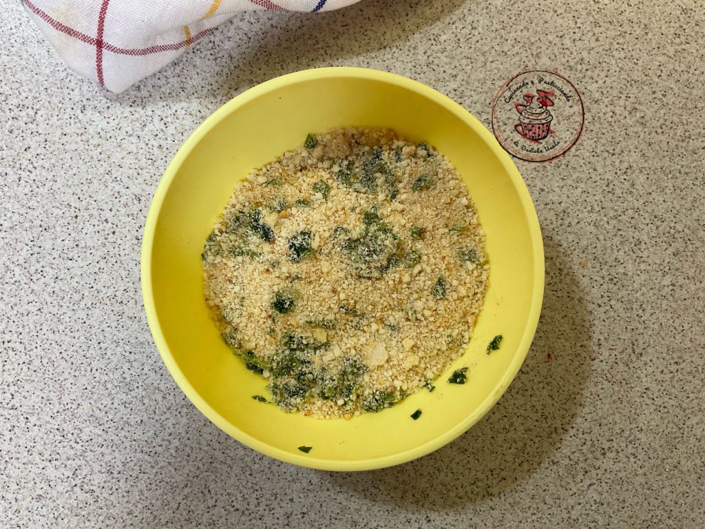En un cuenco colocar el pan rallado, el queso rallado y el perejil y mezclar.