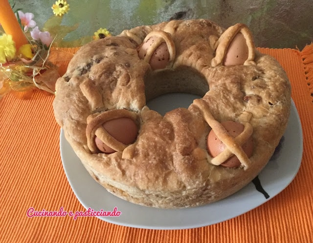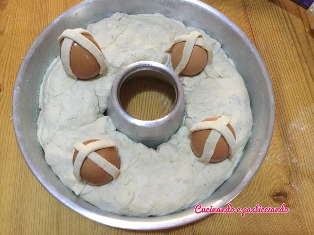 Colocar en el molde engrasado. Colocar como decoración los huevos cocidos y posicionar sobre cada huevo tiras de masa formando una cruz. Dejar levar hasta que el Casatiello llegue al borde del molde.