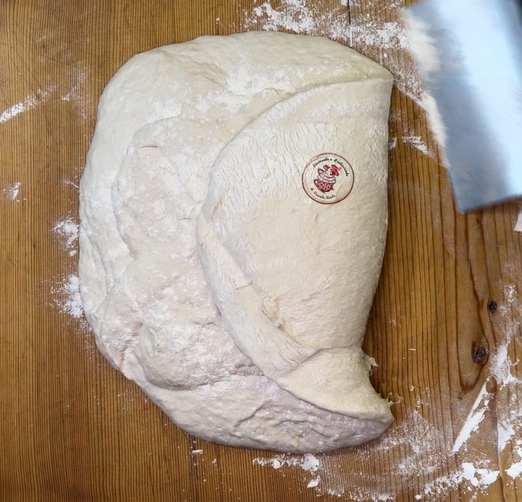 Transferimos a la mesa y hacemos 3 vueltas de pliegues a intervalos de 30 minutos cada uno.