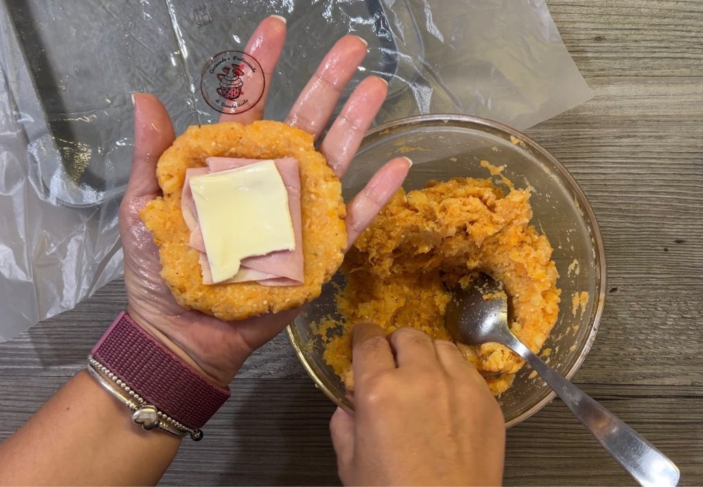 • Tomar puñados de masa, en el centro poner media loncha de jamón y 1/4 de loncha de queso y cerrar con más masa.