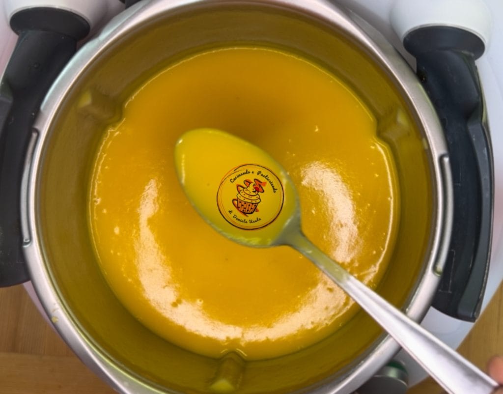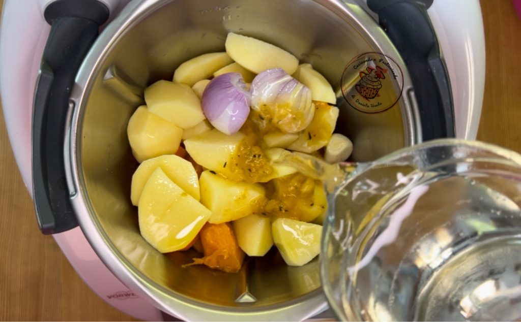 En el vaso ponemos la calabaza y las demás verduras cortadas en trozos. Añadimos el aceite, la pastilla de caldo y las especias. Finalmente añadimos el agua y cocemos durante unos 40 minutos a 100° velocidad 1.