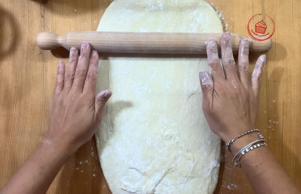 Dividid luego la masa en 4 partes y formad bolas. Extendéis luego cada bola con el rodillo.