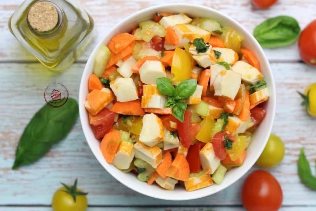 La ensalada de Surimi está buenísima, tanto como aperitivo, como segundo plato. La preparo muy a menudo, porque la ensalada de surimi gusta mucho también a los niños.