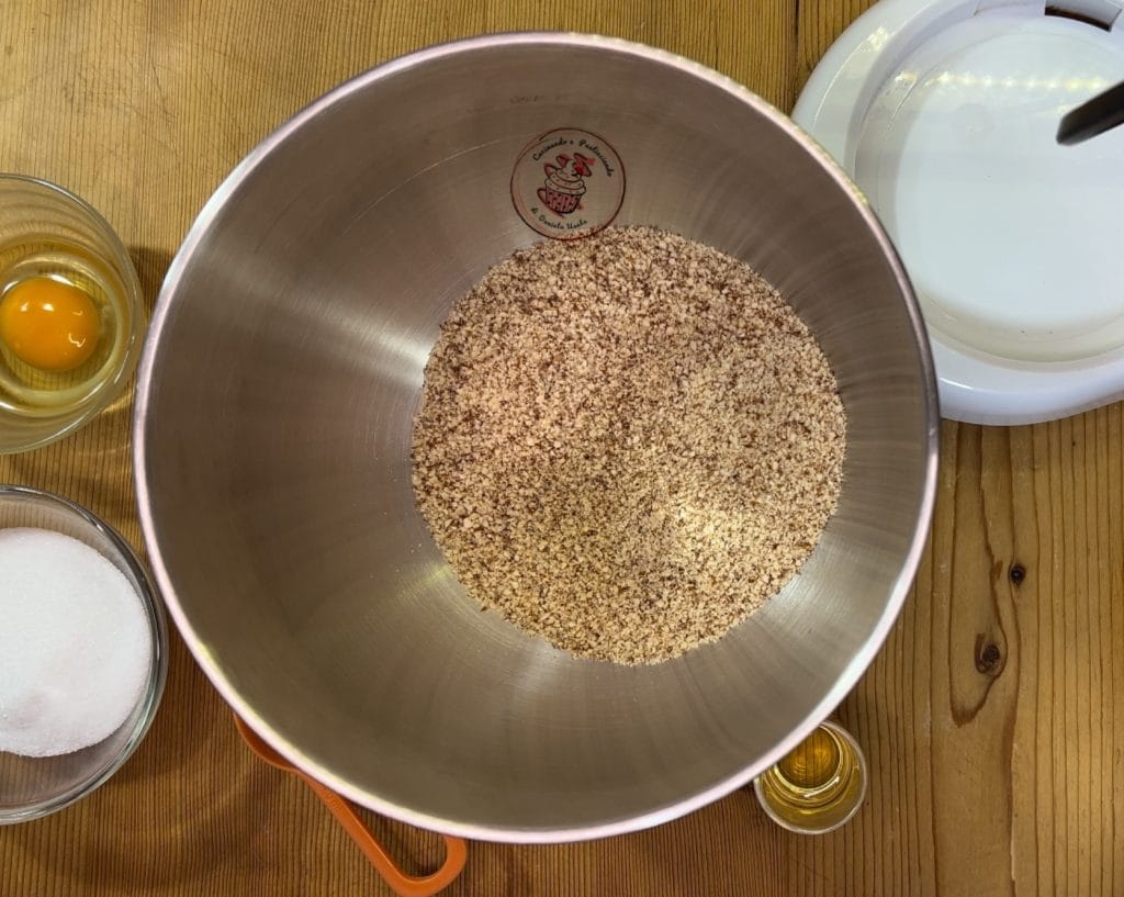 Triturar las almendras en la batidora durante unos segundos y transferirlas al tazón de la planetaria.