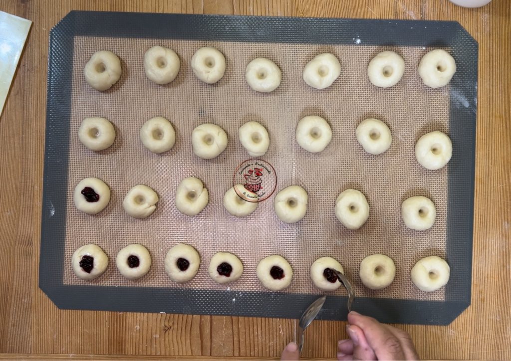 Coloca las bolitas en el tapete (si no lo tienes, servirá una bandeja forrada con papel de horno). Con la punta de un cucharón enharinado haz agujeros en el centro.